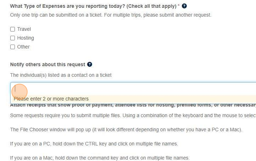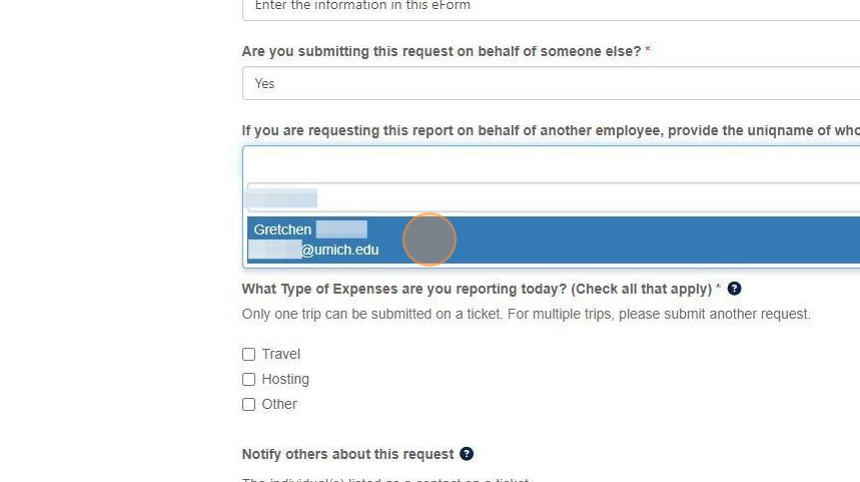 15. Click in the Notify others about this request field and add the name/uniqname/UMID to provide others access to receive updates about a request.